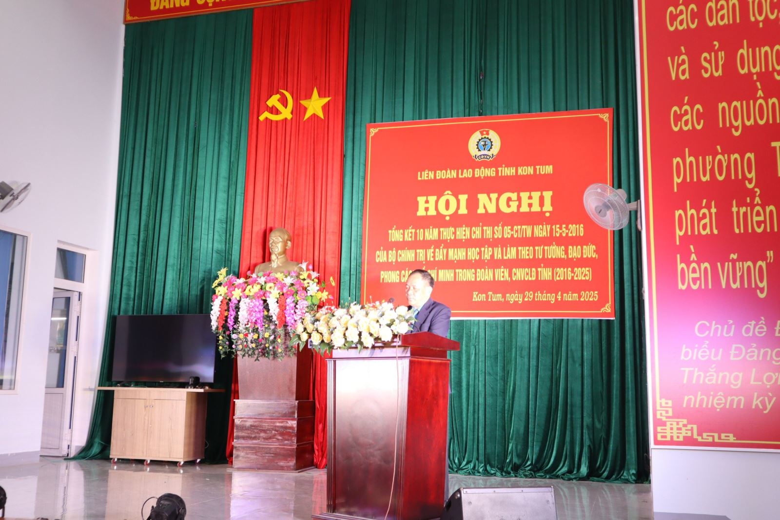 Sáng ngày 29/4/2025, Liên đoàn Lao động tỉnh Kon Tm tổ chức Hội nghị tổng kết 10 năm thực hiện Chỉ thị số 05-CT/TW ngày 15-5-2016 của Bộ Chính trị về đẩy mạnh học tập và làm theo tư tưởng, đạo đức, phong cách Hồ Chí Minh trong đoàn viên, CNVCLĐ tỉnh, giai đoạn 2016-2025. Tham dự Hội nghị có đồng chí Nguyễn Kim Thái - Phó Trưởng Ban Tuyên giáo và Dân vận Tỉnh uỷ, đồng chí Trần Lạc - Phó Chủ tịch Uỷ ban MTTQVN tỉnh, các đồng chí lãnh đạo các Sở, ban, ngành, đoàn thể tỉnh, lãnh đạo các công đoàn cấp trên trực tiếp cơ sở thuộc LĐLĐ tỉnh; đại diện các Công đoàn ngành Trung ương, Công đoàn Tổng Công ty trên địa bàn tỉnh và các tập thể, cá nhân được biểu dương, khen thưởng.