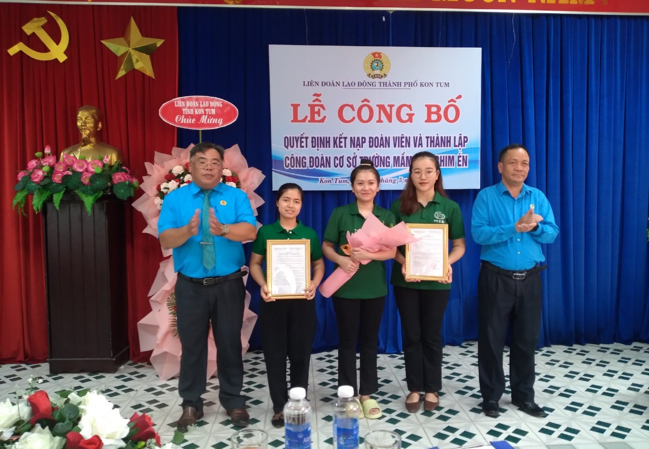 Sáng ngày 18 tháng 5 năm 2024, tại hội trường Khối Mặt trận và các đoàn thể thành phố Kon Tum, Ban Thường vụ Liên đoàn Lao động thành phố Kon Tum đã tổ chức Lễ thành lập Công đoàn cơ sở Trường Mầm non Chim Én và kết nạp 16 công nhân lao động vào tổ chức Công đoàn. Đồng chí Rơ Chăm Long - Tỉnh uỷ viên, Uỷ viên Ban Chấp hành Tổng Liên đoàn Lao động Việt Nam, Chủ tịch Liên đoàn Lao động tỉnh dự và tặng lãnh hoa chúc mừng.