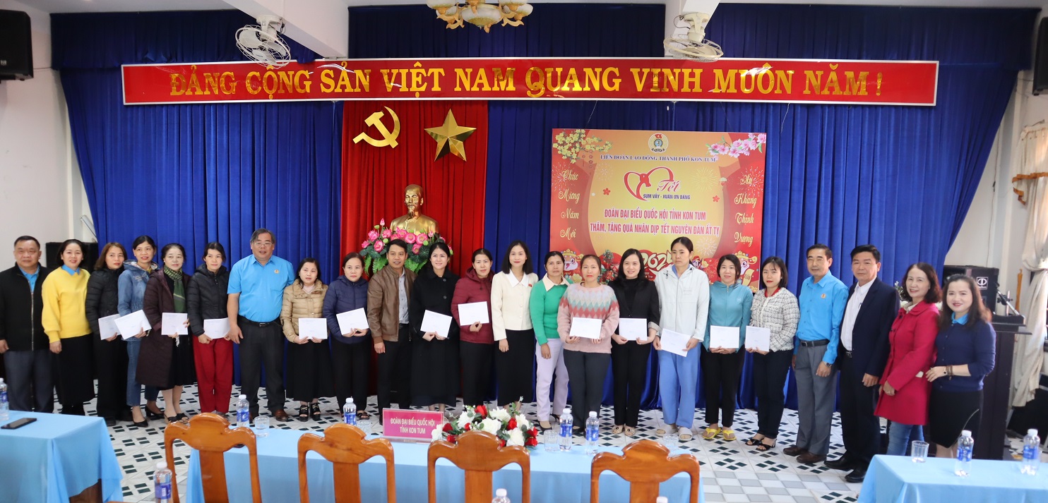 Ngày 22/01/2025, tại Hội trường Khối Mặt trận - Đoàn thể thành phố Kon Tum, Liên đoàn Lao động thành phố đã tổ chức Lễ trao quà của Đoàn Đại biểu Quốc hội tỉnh Kon Tum cho đoàn viên, người lao động có hoàn cảnh khó khăn, bị bệnh hiểm nghèo nhân dịp Tết Nguyên đán Ất Tỵ năm 2025, dự Lễ có đồng chí Rơ Chăm Long - Chủ tịch Liên đoàn Lao động tỉnh, đồng chí Nàng Xô Vy đại diện Đoàn Đại biểu Quốc hội tỉnh đã trực tiếp trao 15 suất quà, mỗi suất trị giá 500.000 đồng.