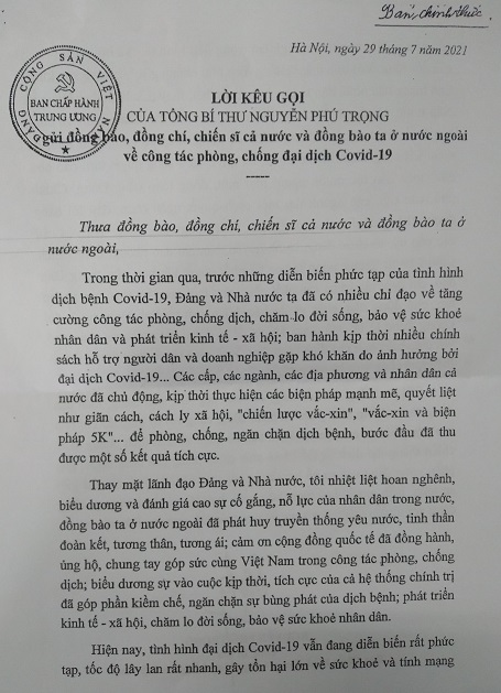 Hiện nay, tình hình đại dịch COVID-19 vẫn đang diễn biến rất phức tạp, tốc độ lây lan rất nhanh, gây tổn hại lớn về sức khỏe và tính mạng của người dân, ảnh hưởng nghiêm trọng đến kinh tế - xã hội và mọi mặt của đời sống. Với tinh thần "chống dịch như chống giặc", bảo vệ sức khỏe, tính mạng của nhân dân là trên hết, trước hết, thay mặt lãnh đạo Đảng và Nhà nước, tôi tha thiết kêu gọi toàn Đảng, toàn dân, toàn quân và đồng bào ta ở nước ngoài: Chúng ta đã cố gắng càng cố gắng hơn nữa; đã đoàn kết càng đoàn kết hơn nữa; đã quyết tâm càng quyết tâm cao hơn nữa; toàn dân tộc muôn người như một, đồng lòng cùng Đảng, Chính phủ, các cấp, các ngành tìm mọi cách quyết ngăn chặn, đẩy lùi bằng được, không để dịch lan rộng, bùng phát trong cộng đồng. Tôi yêu cầu các cấp ủy, tổ chức đảng, chính quyền, ban chỉ đạo phòng, chống dịch COVID-19 từ Trung ương tới cơ sở phải quyết liệt hơn nữa trong lãnh đạo, chỉ đạo; tập trung cao nhất công sức, thời gian, ưu tiên mọi nguồn lực; chủ động nắm chắc và dự báo, kiểm soát tốt tình hình; tuyệt đối không được lơ là, chủ quan, không để bị động, bất ngờ trong ứng phó với diễn biến mới của dịch bệnh; linh hoạt, sáng tạo tổ chức thực hiện có hiệu quả công việc hệ trọng này.