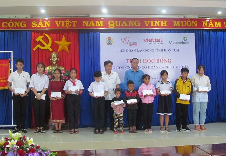 Sáng 30/8 tại Liên đoàn Lao động tỉnh, Liên đoàn Lao động tỉnh cùng các nhà tài trợ đã trao 40 suất học bổng cho con đoàn viên, người lao động có hoàn cảnh khó khăn học giỏi nhân nhân dịp năm học mới 2022 - 2023. Đồng chí Rơ Chăm Long - Chủ tịch Liên đoàn Lao động tỉnh; đồng chí Nguyễn Trọng Thắng – PGĐ Sở Giáo dục và Đào tạo tỉnh; đại diện Tập đoàn Công nghiệp - Viễn thông quân đội Viettel và đại diện Ngân hàng Thương mại cổ phần Ngoại Thương Việt Nam VietCombank - Chi nhánh Kon Tum; lãnh đạo các cấp công đoàn, phụ huynh và 28 em đã dự và nhận học bổng.